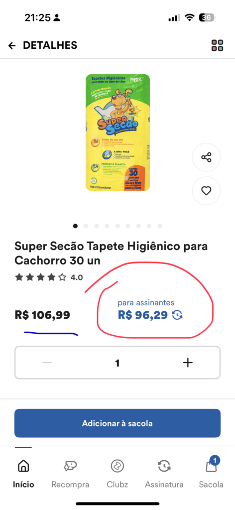 Agora veja acima 👆 no print da tela que o valor cheio do produto, Tapete Higiênico Super Secão, com 30 unidades, na data de 31/03/2026, está listado na Petz por R$ 106,99 e com o desconto de assinante neste exemplo vai à R$96,29.