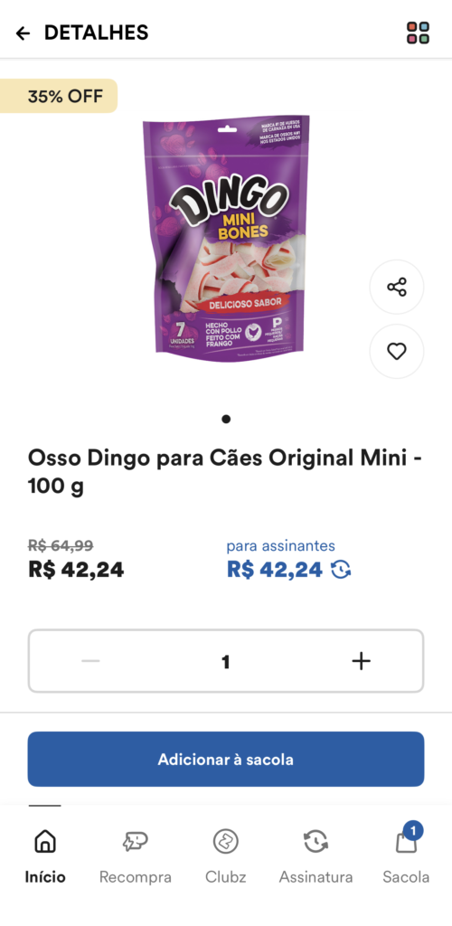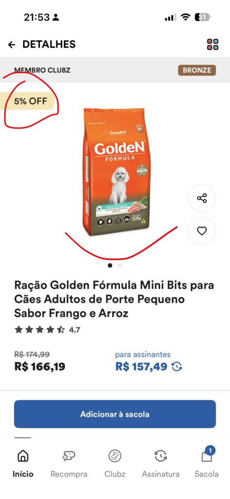 Um Produto está listado na Petz com uma oferta de 5% de desconto: