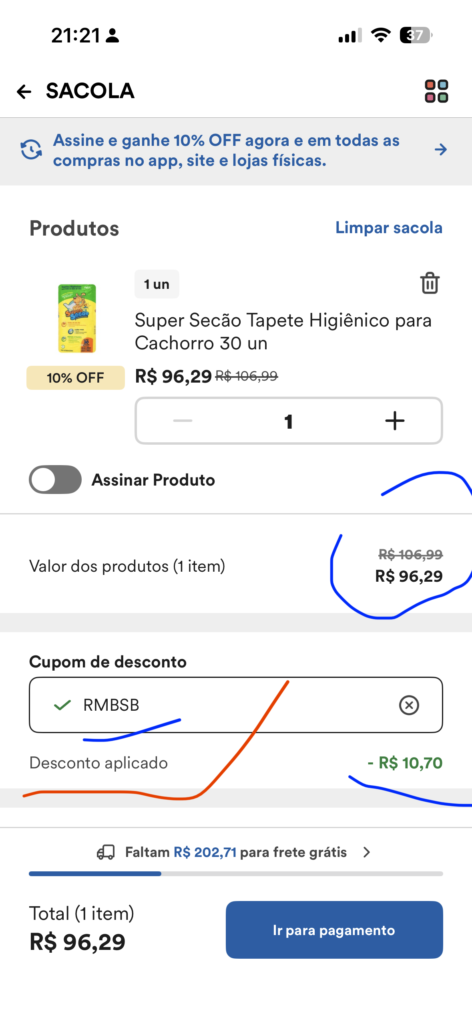Agora veja na imagem abaixo 👇 que este produto embora já esteja em oferta de 5%, com o Cupom Petz: RMBSB, você consegue os 10% no final, ele troca os 5% off pelos 10% off.